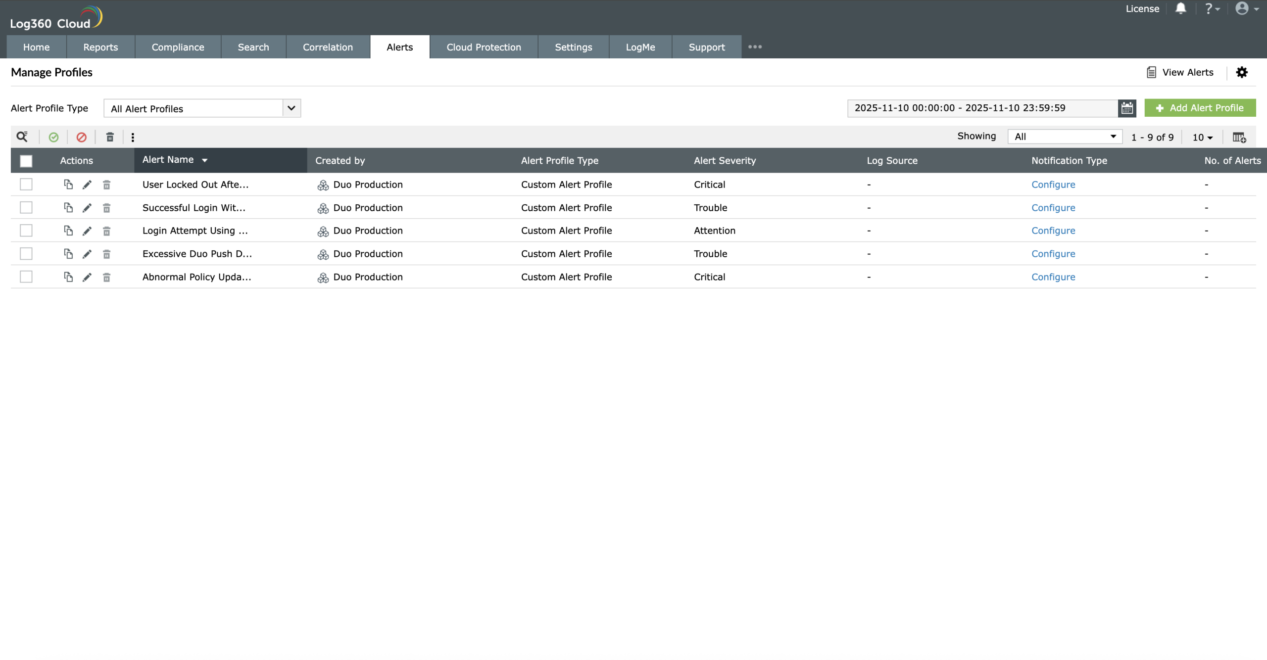 Use the Created By column to identify CiscoDuo alert profiles. Select the profile(s)